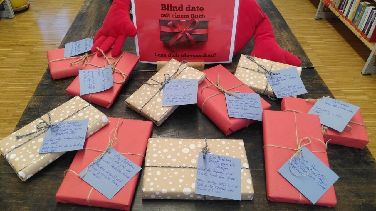 "Blind date" mit einem Buch Wenn du bei einem "blind date" ein neues Buch kennenlernen willst, komm einfach in der Bibliothek vorbei. Bunt eingepackte Bücher warten darauf, dass du sie auspackst und mitnimmst - und viel Freude beim Lesen hast.